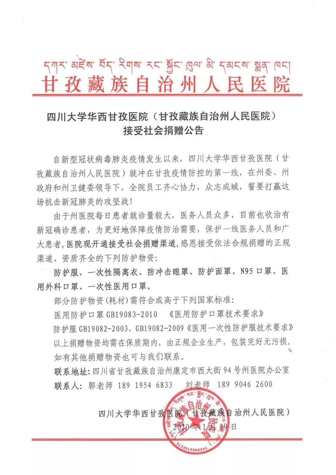 為積極應(yīng)對新型冠狀病毒感染肺炎疫情,甘孜州紅十字會正全力參與疫情防控工作,全力配合做好社會各界愛心捐贈接收,現(xiàn)將有關(guān)事宜公告如下:
