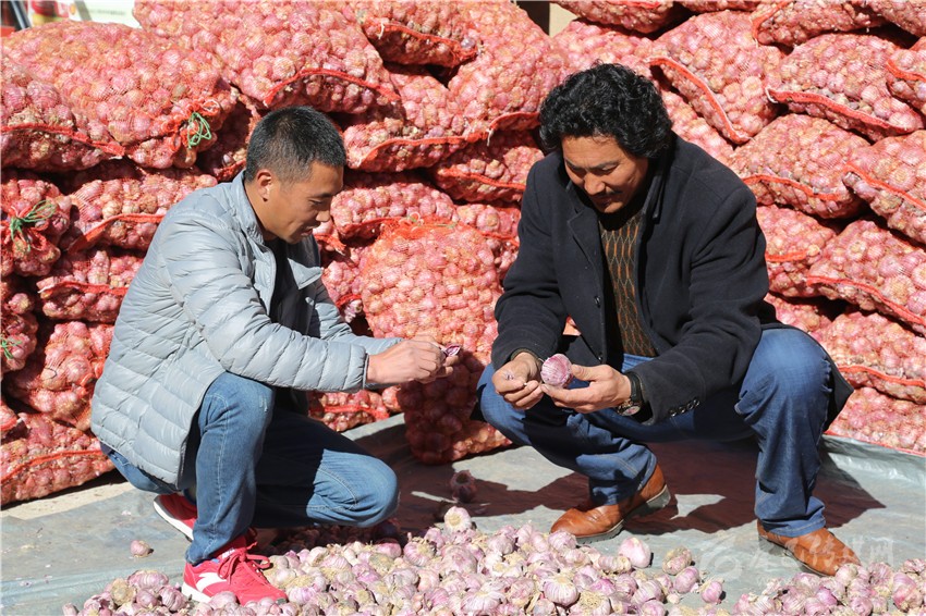 為保證裝袋大蒜質(zhì)量,村民們分工對晾曬后的大蒜進行分揀,壞的和不合格的堅決不要,裝袋后由村支部進行復檢,確定每袋大蒜符合出售要求后再進行裝車?!拔曳N了4畝大蒜,今年收成很好,平均畝產(chǎn)達500斤以上,如果行情好的話,明年我還準備增加種植面積。”村民貢嘎滿懷喜悅地說??粗b滿大家“心血”的拖拉機漸行漸遠,村民們不時你一言我一語地討論著今年的收成,臉上滿是止不住的喜悅。