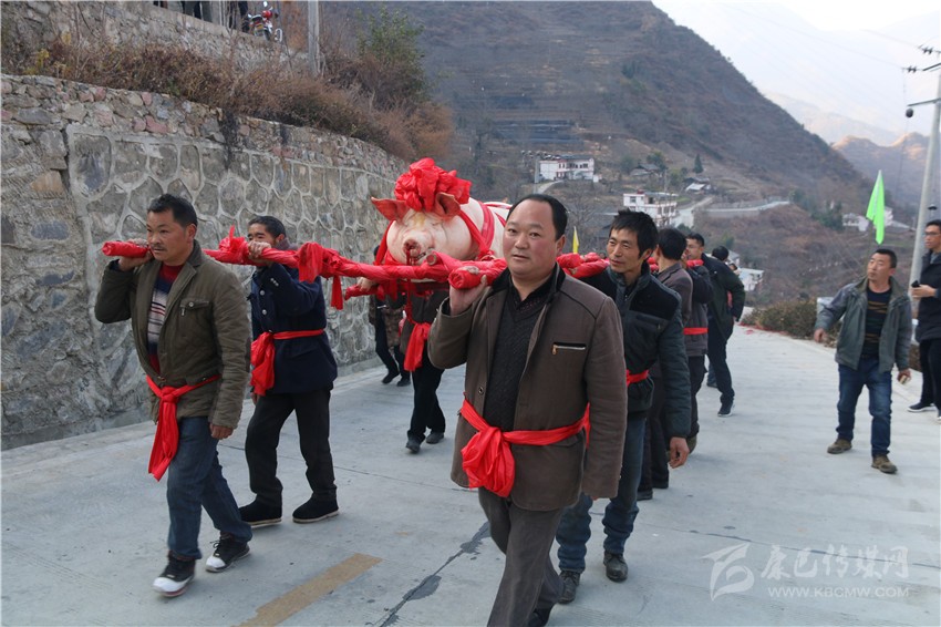 5個村民將年豬抬到秤上。360斤。村民為年豬準備大紅花。準備紙錢、香蠟。9點整,殺豬匠開始了他的工作,在眾人齊心協(xié)力下,光溜溜的年豬被打整干凈?!氨S游覀兇鍋砟觑L(fēng)調(diào)雨順、五谷豐登,村民平安健康?!贝逯欣险呔催^天地后,8個身強力壯的村民站在年豬旁,豎著拇指齊聲說,今年家家戶戶還要養(yǎng)大肥豬。抬著年豬,村里的中老年人簇擁著,走在最前面,唱著悅耳的民謠,大意是歌唱幸福生活的,迎著2018年的第一縷陽光,村民們喜氣洋洋。到村里來的游客蜂擁拍照。