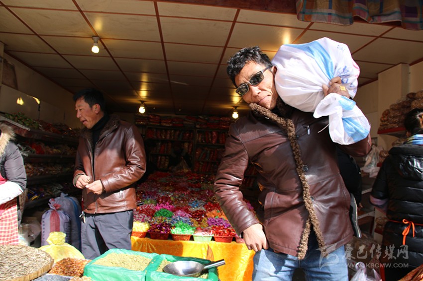 走進郭達橋重康糖果店,洛讓說:“多買點糖果糕點,娃娃老婆喜歡?!比缓笳諉吸c貨:花生10斤、瓜子5斤、葡萄干5斤、水果糖5斤、軟糖5斤、炒米糖10斤……一下就指點了八九種糖果糕點??吹搅诉@樣的生意,老板樂開了花。與洛讓大包大攬的氣派不同,長期經(jīng)商的扎西老練地詢價:“老板,我們買這么多,要優(yōu)惠喲。”一番討價還價之后,洛讓和扎西買了十種糖果,用去1066元,裝滿整整兩編織袋。洛讓把糖果過扛在肩上,對筆者說:“你來試一下,有點分量,你別說,辦年貨也是一種體力活喲。”