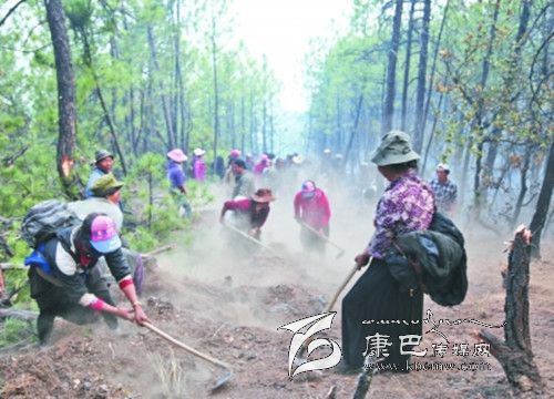在干群協(xié)力撲救元根山森林火災(zāi)的壯歌中,沙貢鄉(xiāng)達(dá)根村已71歲的村支部書(shū)記澤仁鄧珠沒(méi)有因年齡而退卻,他帶領(lǐng)本村十余人的背水隊(duì)伍每天從山腳到山頂不知疲勞地往返送水,陡峭山路有時(shí)得手腳并用往上爬,累了就拄著用樹(shù)枝做的拐杖休息片刻,餓了就掏出隨身帶的鍋盔啃上幾口。6月2日凌晨3時(shí),老支書(shū)帶上村民趕到火場(chǎng)時(shí),看到先期到達(dá)火場(chǎng)的縣領(lǐng)導(dǎo)臉上汗水和著草木灰,卻依然在鎮(zhèn)定的指揮撲救工作。感動(dòng)之余,來(lái)不及休息和吃飯,澤仁鄧珠跑到指揮部請(qǐng)纓要求帶領(lǐng)群眾到一線參與滅火,當(dāng)?shù)玫接勺约贺?fù)責(zé)帶領(lǐng)群眾運(yùn)水上山的任務(wù)后,老支書(shū)和同期到達(dá)的群眾背上消防桶每天早出晚歸,將一桶又一桶珍貴如油的水背負(fù)到火場(chǎng),直到森林火災(zāi)徹底撲滅。