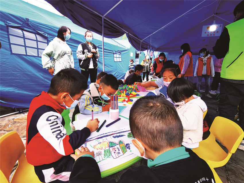 “這頂帳篷中充滿了孩子們的歡聲笑語(yǔ),這在地震災(zāi)區(qū)就是最動(dòng)聽的聲音?!惫睬鄨F(tuán)甘孜州委統(tǒng)戰(zhàn)社會(huì)聯(lián)絡(luò)部部長(zhǎng)澤仁娜姆介紹,地震發(fā)生后,團(tuán)州委第一時(shí)間組織3193名志愿者,24支青年突擊隊(duì)參與應(yīng)急志愿者工作,并在磨西鎮(zhèn)貢嘎廣場(chǎng)分配38名志愿者參與后勤保障工作,其中5個(gè)人便成為了“青青兒童樂園”里的“保育員”,“孩子們可以在這里畫畫、做游戲,還能在老師輔導(dǎo)下學(xué)習(xí),他們不安的情緒也得到安撫,臉上的恐懼也逐漸被微笑取代。”