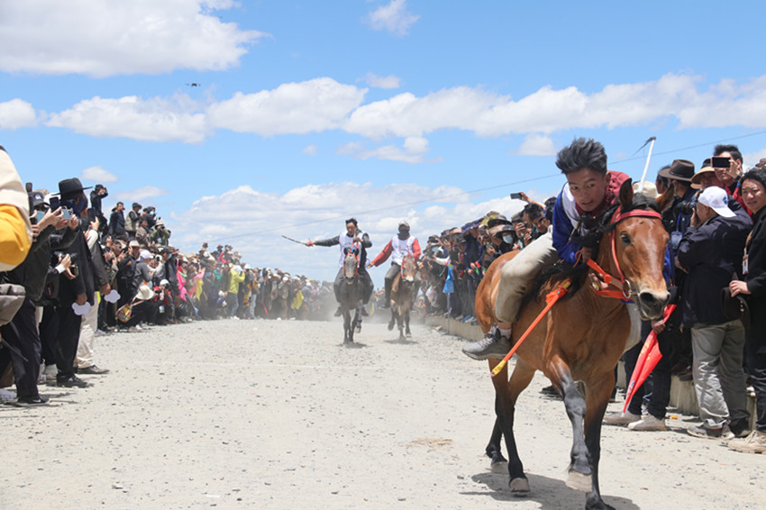 雪山潔白、青稞碧綠,雪白的貢嘎海棠搖曳在枝頭,目之所及,皆是風(fēng)景。騎手騎著自己心愛的馬兒,一個(gè)個(gè)英姿颯爽、神采飛揚(yáng)。隨著發(fā)令員的口號(hào)響起,駿馬像離弦的箭一樣飛奔出去,騎手們?nèi)笺T足了勁,勢必要在比賽中拔得頭籌。賽道上的駿馬你追我趕,賽道邊慕名前來的游客和周邊村民吶喊加油,跑出了甘孜兒女奮發(fā)向上、積極進(jìn)取的精神風(fēng)貌。