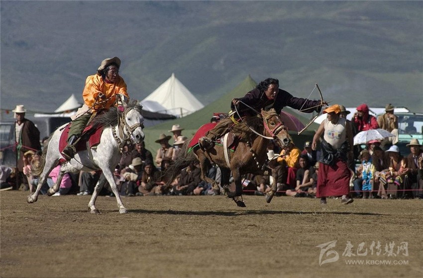 賽馬活動中的分耐力賽、小走賽、馬術(shù)表演等,馬術(shù)表演有馬背倒立、飛馬射擊、馬肚藏身、俯身拾哈達(dá)等項目。驚險刺激的賽馬,是充分展示藏區(qū)群眾健壯、靈巧和勇猛、膽大的一項活動,也是當(dāng)?shù)厍鄩涯瓯绕雌潴w魄、智慧和膽識的舞臺,對年輕小伙兒來說,這還是一個捕獲心儀的姑娘的芳心的絕好時機。所以,在康巴地區(qū)的賽馬活動始終都保持著精彩、激烈的特征。