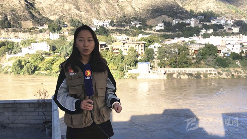 得榮電視臺(tái)記者在報(bào)道身后金沙江的水情變化。