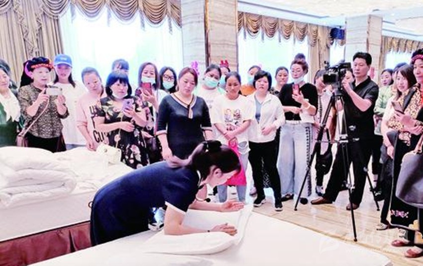 先檢查床箱與床墊是否吻合,床墊拉出40公分,鋪床前撣去床上毛發(fā),接下來開始甩單,床單正面朝上,床單中線居中,兩邊吊邊均等,甩單動作簡單瀟灑,準確到位。這是7月8日,稻城縣文旅行業(yè)從業(yè)人員培訓(xùn)會上,筆者見到學(xué)員在教師的指導(dǎo)下表演的精彩一幕。