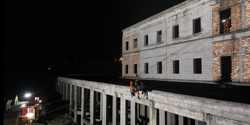 現(xiàn)場(chǎng)還模擬了孤島救援科目。因地震導(dǎo)致震中區(qū)域地質(zhì)松懈,呈塌陷現(xiàn)狀,水位下降,被困人員所在區(qū)域水位下降且通行道路損毀形成孤島。救援隊(duì)伍通過(guò)偵查,決定采取利用救生拋投器將繩索打至對(duì)岸形成橫渡條件,再利用T型繩索救助技術(shù)將人員和器材輸送至湖心島,通過(guò)破拆、頂撐技術(shù)將孤島被困的壓埋人員救出,隨后對(duì)被困人員包扎、固定后利用繩索將被困人員轉(zhuǎn)移至安全區(qū)域。