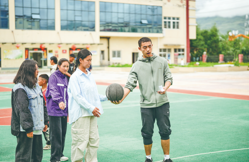 “天空之城”團(tuán)隊(duì)成員教孩子們打籃球。