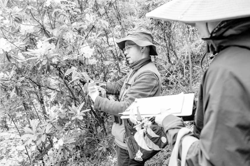 回到山腳,張遠(yuǎn)彬正在打開植物“盲盒”。“這里海拔差別大,杜鵑的種類特別多,這是以前沒有記錄到的。”張遠(yuǎn)彬直呼“驚喜”,邊用手機(jī)拍下形態(tài),邊口述特征讓一旁的助手記錄。