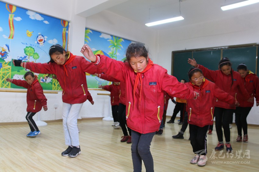 “要跟隨節(jié)拍,注意動作協(xié)調連貫,舞蹈是非常愉悅的享受,要面帶微笑,動作不要太僵硬?!痹谖璧甘?,老師正耐心地糾正孩子們的舞蹈動作。老師是縣文化館的專業(yè)演員,成為學校的舞蹈老師后,她就負責全校的舞蹈教學工作。