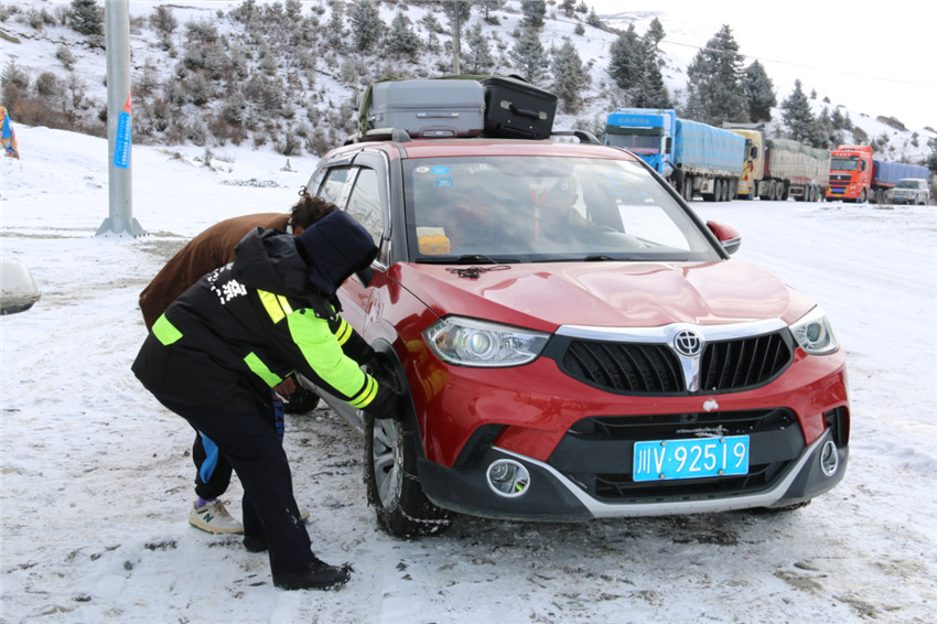 日前,受強(qiáng)降雪天氣影響,國道G248丹巴縣東谷鎮(zhèn)牦牛溝路段路面積雪結(jié)冰情況嚴(yán)重,丹巴縣公安局交警大隊(duì)聞?dòng)嵍鴦?dòng),第一時(shí)間按照縣局春運(yùn)道路交通安全管理工作要求,及時(shí)調(diào)整勤務(wù),部署警力。通過設(shè)置臨時(shí)檢查點(diǎn)、交通安全提示牌配合交警勸導(dǎo)的方式,提示過往駕乘人員遵守交通法規(guī),安全文明行車。同時(shí)幫助進(jìn)溝車輛懸掛防滑鏈,并加強(qiáng)路面巡查,及時(shí)援助受困車輛,保障道路安全順暢。