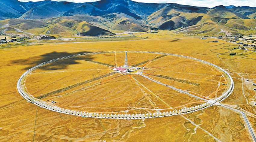飛機從稻城亞丁機場起飛,右側舷窗外的地面隱現(xiàn)一個小圓點,因為造型特殊,當?shù)厝朔Q“千眼天珠”。小圓點其實一點也不“小”——在海拔3820米的甘孜州稻城縣噶通鎮(zhèn),313部直徑6米的天線,均勻地分布在直徑1公里的圓環(huán)上。它的正式名字叫圓環(huán)陣太陽射電成像望遠鏡(下稱“圓環(huán)陣”),是國家重大科技基礎設施空間環(huán)境地基綜合監(jiān)測網(子午工程二期)的標志性設備之一,也是目前已建成的全球規(guī)模最大的綜合孔徑射電望遠鏡。其任務主要是對太陽和日地空間傳播鏈條進行高質量監(jiān)測,監(jiān)測太陽“打噴嚏”。